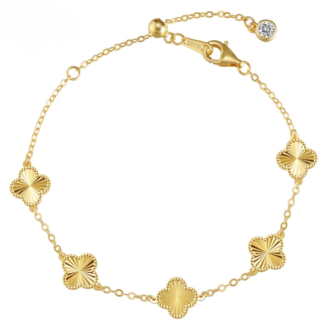 Inspired by the timeless beauty of the clover, this bracelet is more than just an accessory—it’s a symbol of faith, hope, love, and luck. The delicate four-leaf clover motif, plated in luminous 18K gold, embodies positive energy and elegance. Its intricate design ensures a balance between modern sophistication and classic charm, making it the perfect piece for daily wear or special occasions.